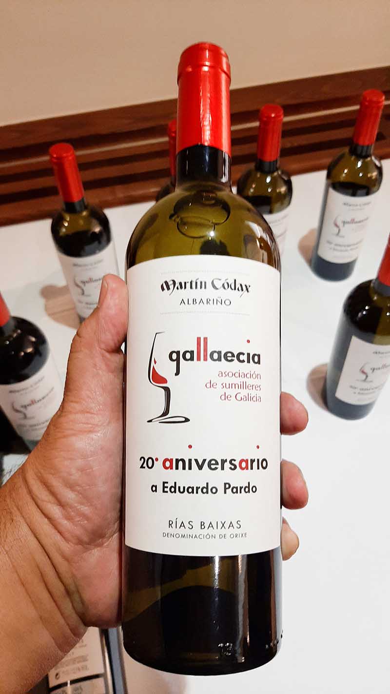 Aprovechando la entrega de las XXI Distinciones Gallaecia, la Asociación de Sumilleres de Galicia hicimos entrega a los asociad@s del Vino XX Aniversario Homenaje a Eduardo Pardo. Las uvas de este vino fueron vendimiadas por los sumilleres de Gallaecia en el 2017 en la finca Pé Redondo de la bodega Martín Códax. Durante dos años se ha hecho un seguimiento del vino a través de catas periódicas y se decidió que este era el momento oportuno para embotellarlo y hacer entrega de las botellas a los asociados de Gallaecia y a la familia Pardo.