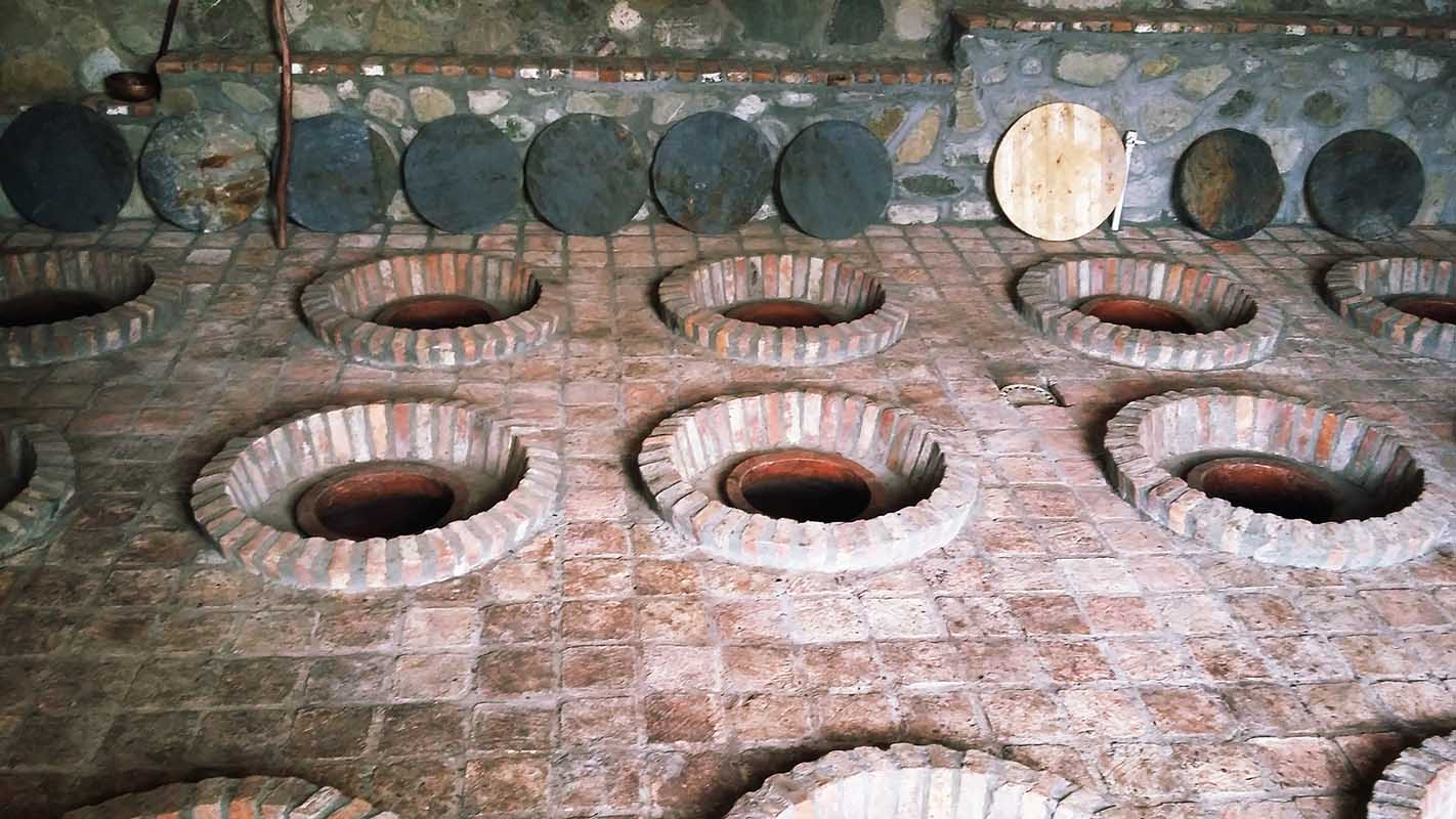 Sin duda uno de los mayores atractivos de la vinicultura georgiana son sus grandes depósitos de arcilla que, soterrados, producen vinos ámbar y tintos únicos en el mundo. Conocidos como “Quevris”, su uso en la región es milenario por lo que su forma y tamaño han ido cambiando con el tiempo, en gran parte para adaptar la superficie de contacto con los hollejos (y en consecuencia la capacidad de extracción) al gusto de cada época. Lo que se ha mantenido inamovible es la ancestral práctica de fermentar el vino con las pieles lo que, en el caso de las uvas blancas, da lugar a los genuinos “Amber Wines”.