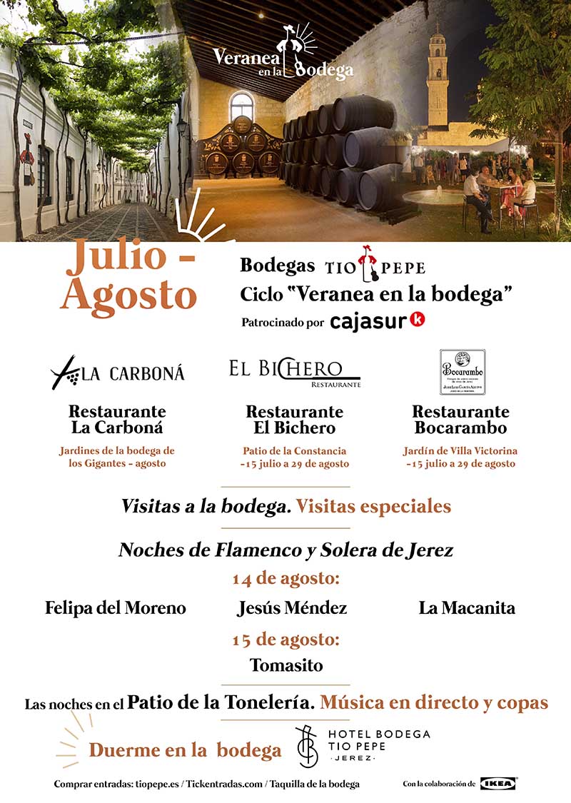 Es posible veranear en la bodega con la propuesta que González Byass ofrece para disfrutar del mundo del vino y la gastronomía en cada uno de sus mágicos rincones. “Veranea en la bodega” brinda, durante los meses de julio y agosto, vivencias innovadoras y diferentes en las que se alargarán las noches con catas magistrales, visitas especiales y música en directo. Como broche final, se podrá dormir en el Hotel Bodega Tío Pepe. Además, contará con importantes y tradicionales restauradores de la comarca que ofrecerán experiencias gastronómicas en los patios, jardines, bodegas y calles emparradas de González Byass.