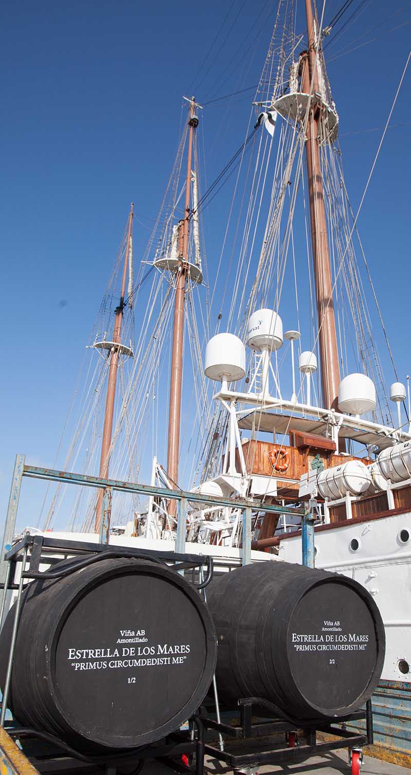 González Byass escribe una nueva página en la historia del mundo del vino. Lo hace con el regreso a sus bodegas de un Amontillado de Jerez que ha recorrido los mares y océanos del planeta a bordo del “Buque Escuela de la Armada Española Juan Sebastián de Elcano”. Se trata del vino Viña AB “Estrella de los Mares”, cuyo nombre evoca el astro que guía a los marinos en la mar, y del que González Byass ha embarcado dos medias botas en el buque escuela de la Armada Española para hacer “viaje redondo”, una tradición bodeguera que consistía en enviar botas en las largas travesías para que la mar favoreciera la evolución del vino.