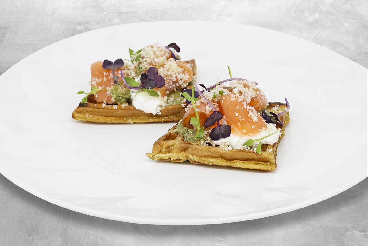 - Belbo Terrenal: gofre, burrata, salmón marinado con hierbas balsámicas y pesto de nuez de Macadamia