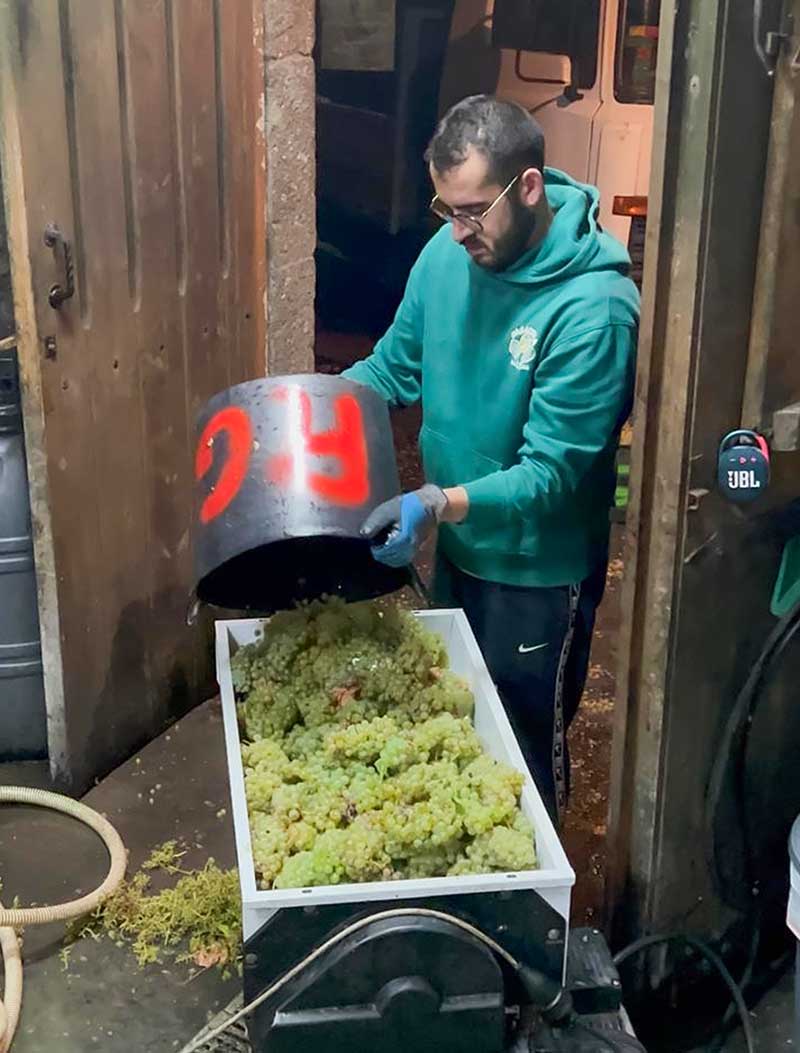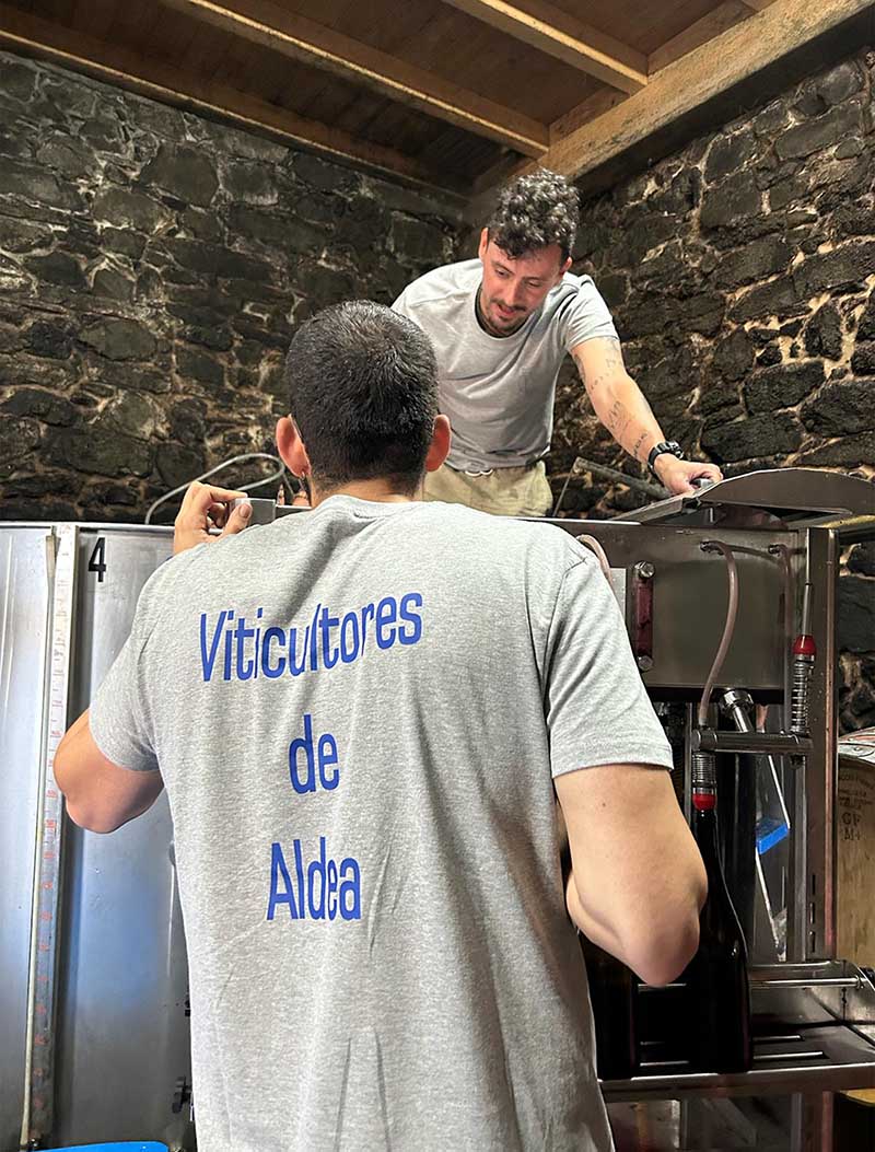 Nosotros nos centramos en la elaboración de viñedos blancos, porque hay un nicho de mercado, digamos. No existen muchos viñedos blancos en Ribeira Sacra. Conocimos a un viticultor mayor, que trataba el viñedo de la manera que nosotros queríamos, o por lo menos más cerca de lo que nosotros queríamos: sin uso de herbicidas, sin uso de ciertos productos químicos… somos muy artesanales. Buscamos marcar mucho las variedades autóctonas, bajar las dosis de sulfuroso y darle mucho carácter al vino. En resumen, queremos reflejar básicamente son vinos naturales, de poca intervención, mejor dicho. De la mínima intervención posible, para representar la autenticidad de las variedades.